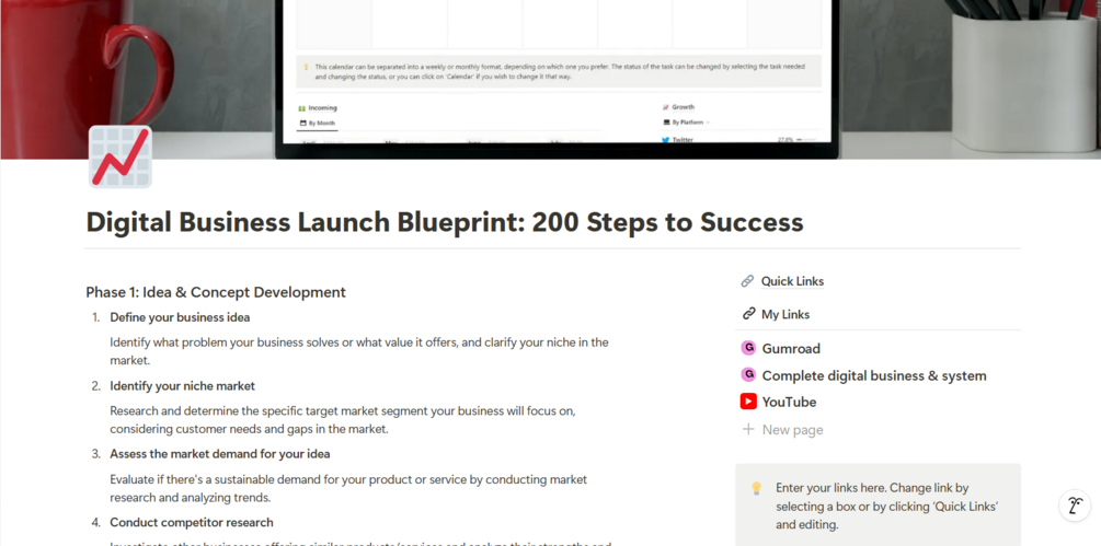 Turn your business dream into a digital reality with the Digital Business Launch Blueprint! This comprehensive 200-step checklist is designed to guide you smoothly through every phase of starting and launching your digital business. From the initial idea to a fully operational online presence, this Notion template has each critical task mapped out in clear, actionable steps so you won’t miss a beat.